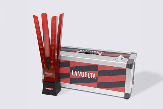 - Archivo de la historia. El trofeo principal, otorgado al portador del maillot rojo, incorpora los nombres de los 90 vencedores históricos de la Vuelta.